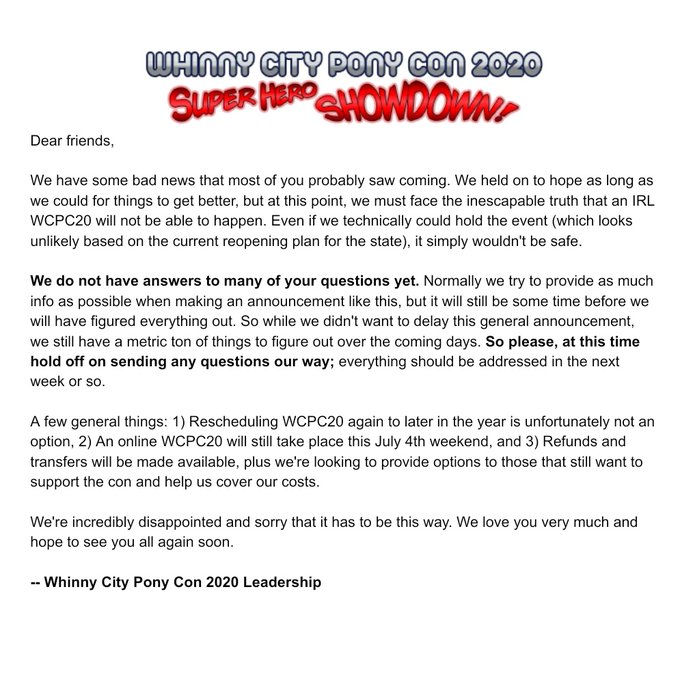 Whinny City Pony Con 2020 has officially been cancelled, but only in-person. The con will be moving online this year and will take place July 4th weekend.